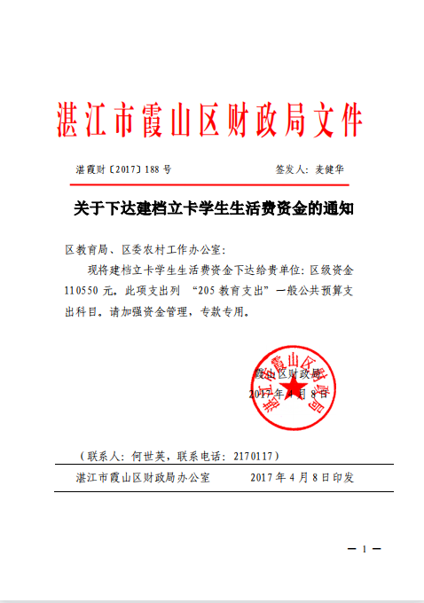 湛霞财[2017]188号关于下达建档立卡学生生活费资金的通知