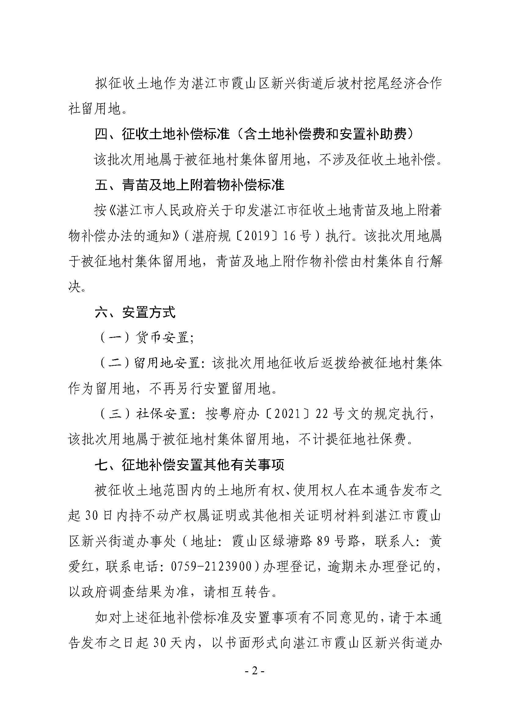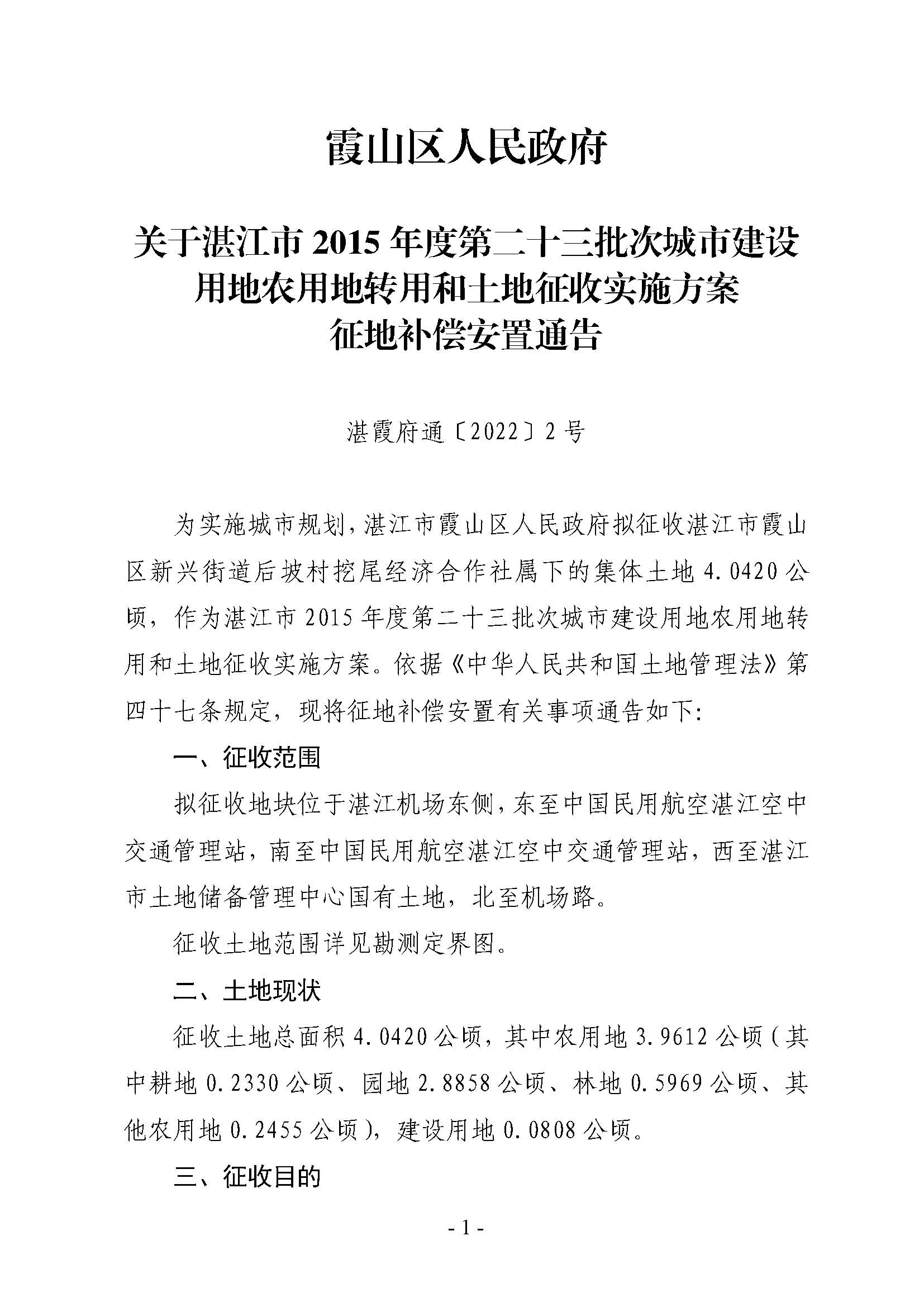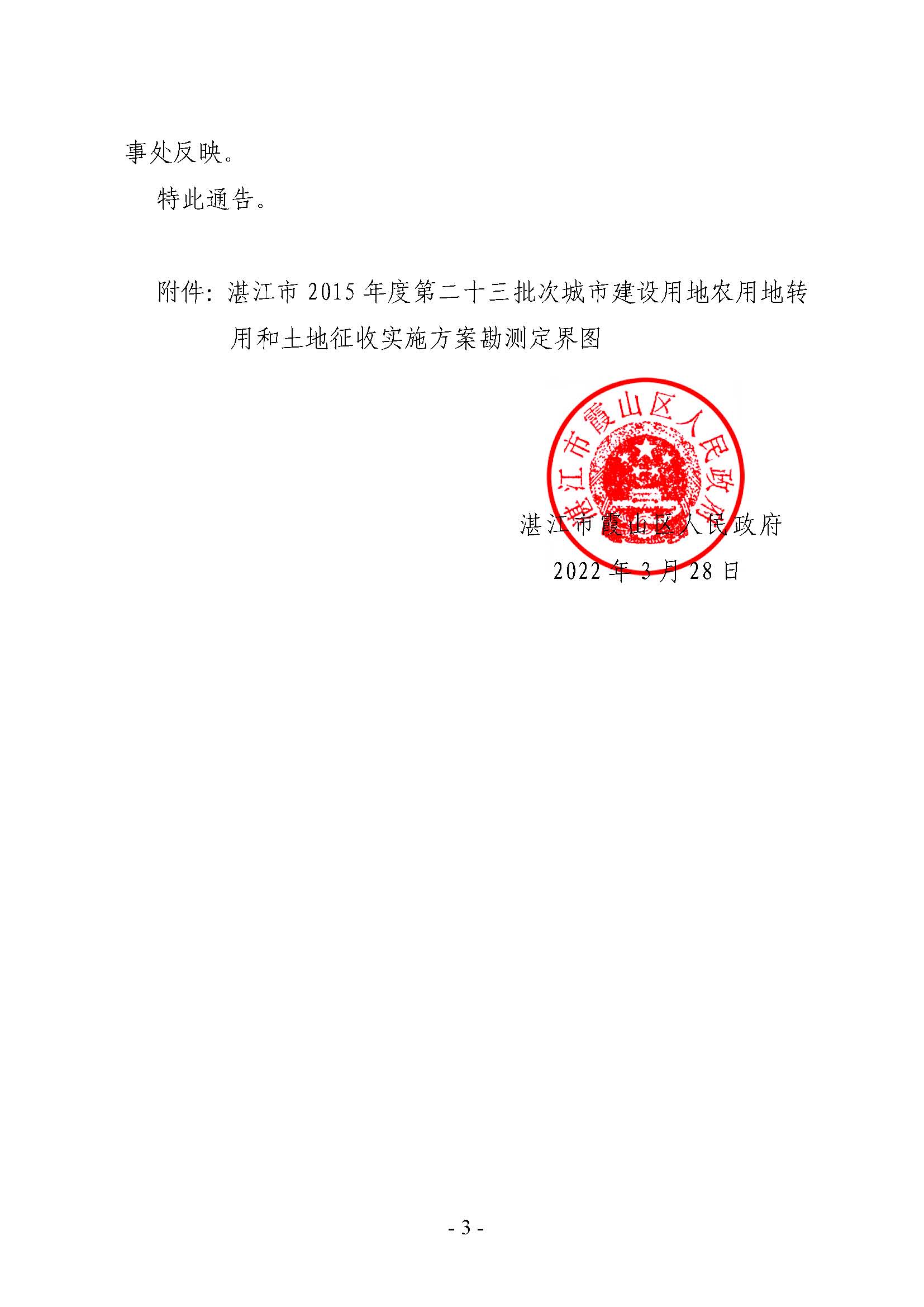 霞山区人民政府关于湛江市2015年度第二十三批次城市建设用地农用地转用和土地征收实施方案征地补偿安置通告
