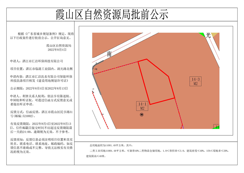 湛江市汇洁洗衣有限公司智能环保科技洗涤项目核发《建设用地规划许可证》批前公示