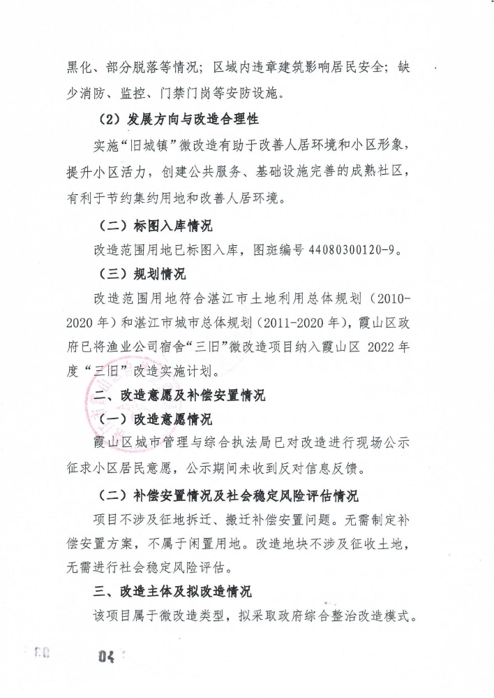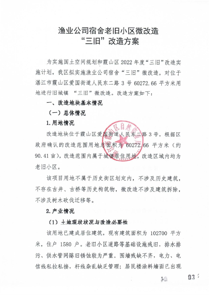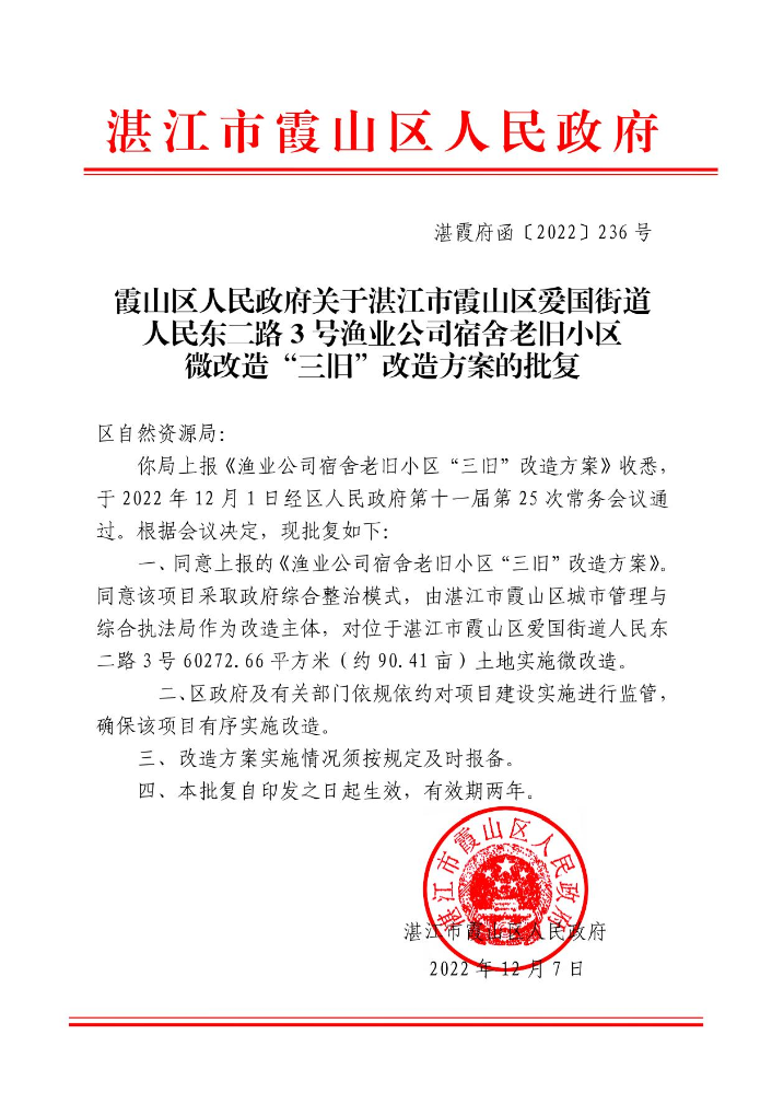 霞山区人民政府关于湛江市霞山区爱国街道人民东二路 3 号渔业公司宿舍老旧小区微改造“三旧”改造方案的批复
