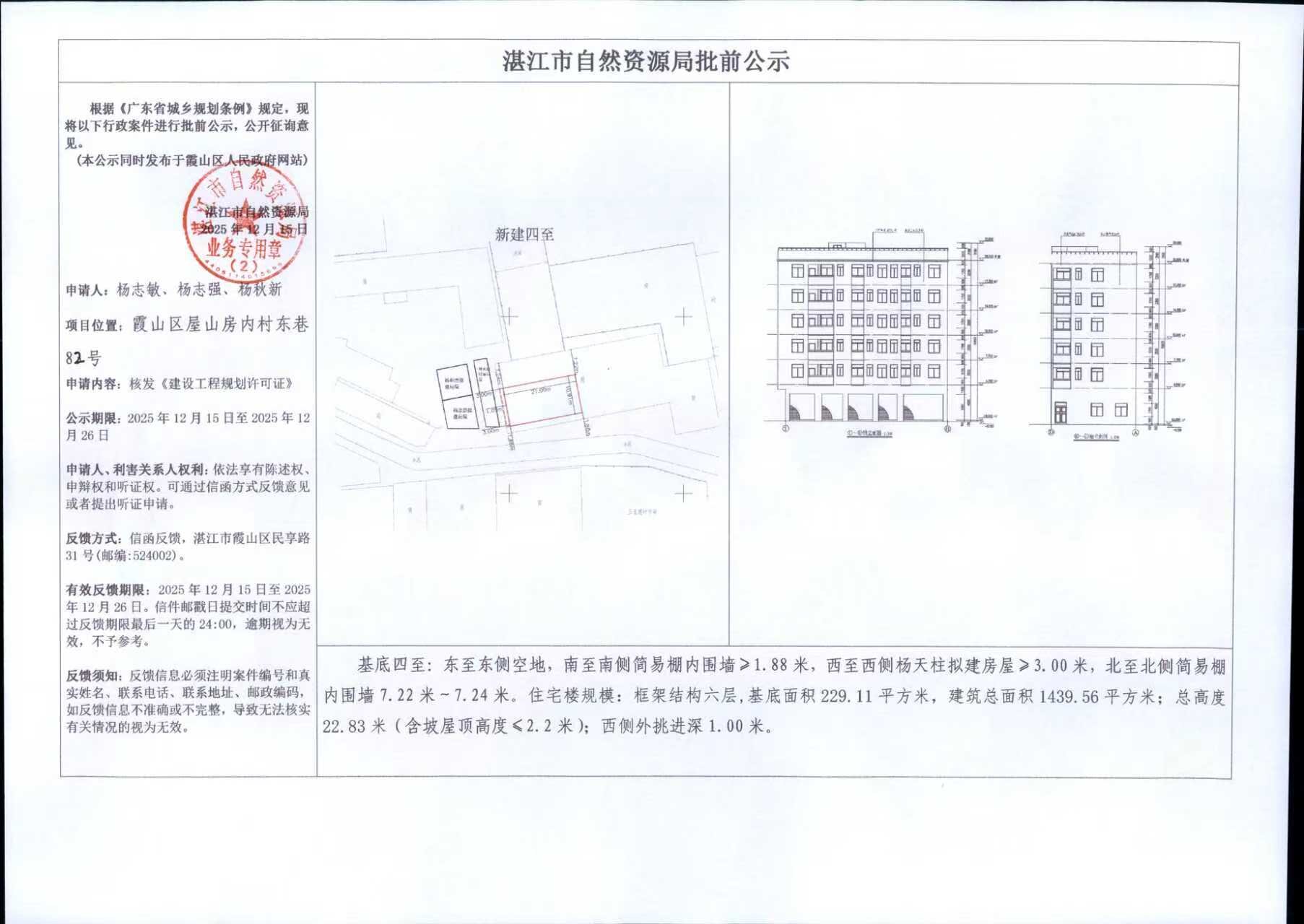 霞山区屋山房内村东巷82号(杨志敏、杨志强、杨秋新)新建房屋核发《建设工程规划许可证》批前公示