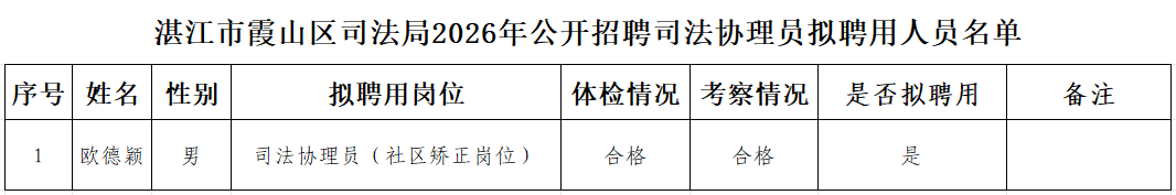 根据《湛江市霞山区司法局2026年公开招聘司法协理员公告》和《霞山区开展司法协理员试点工作的实施方案》等有关文件要求,欧德颖同志经报名、资格审查、面试、体检、考察等工作程序符合聘用条件,拟聘用欧德颖同志为霞山区司法局司法协理员(社区矫正岗位),现将有关情况予以公示。公示期间,如对聘用人选有异议或其他问题,任何单位和个人均可通过来信、来电、来访等形式向霞山区司法局政工办反映。
