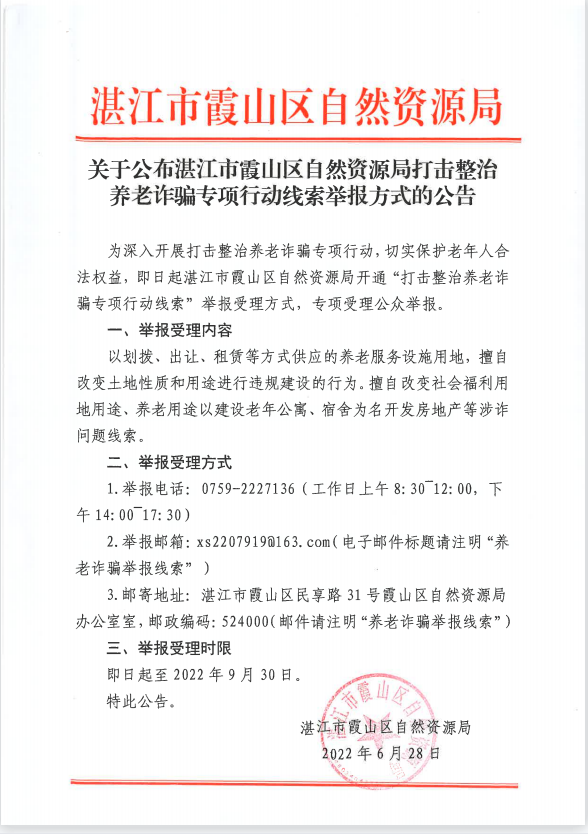 关于公布湛江市霞山区自然资源局打击整治养老诈骗专项行动线索举报方式的公告