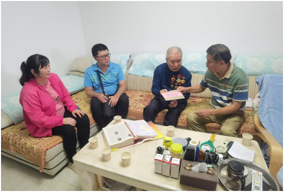 区退役军人事务局钟敏副局长、新兴街道退役军人服务站专干与方兴社区工作人员一同为庞炎老兵送上慰问金