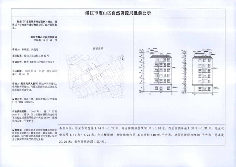 霞山区东山村三路42号(林康莲、吴斐迪)新建房屋核发《建设工程规划许可证》批前公示