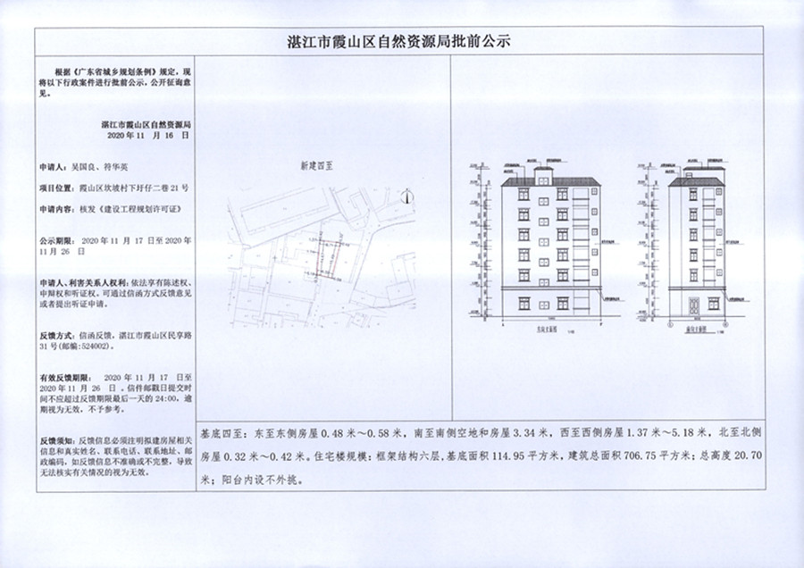 霞山区坎坡村下圩仔二巷21号(吴国良、符华英)新建房屋核发《建设工程规划许可证》批前公示