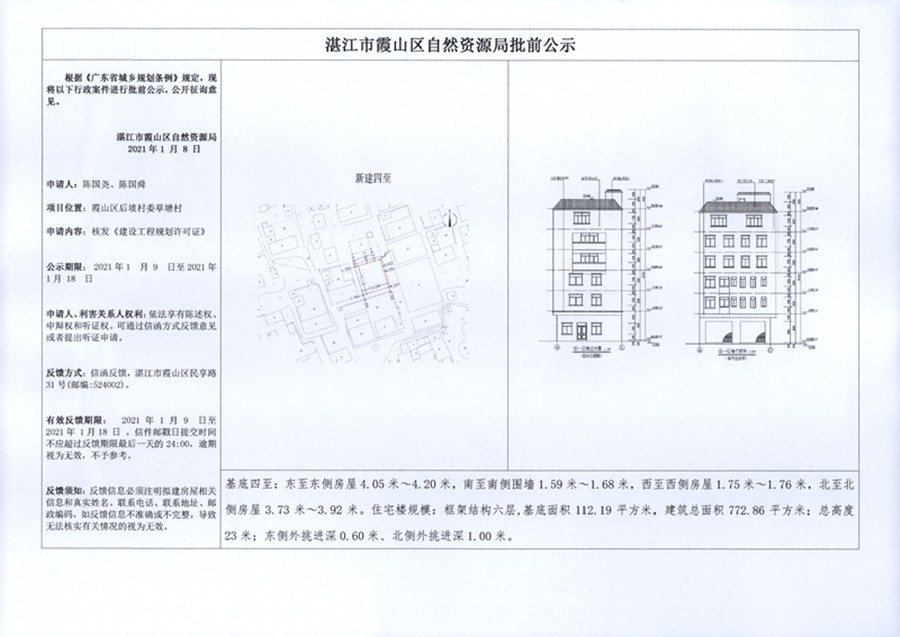 霞山区后坡村委草塘村(陈国尧、陈国舜)新建房屋核发《建设工程规划许可证》批前公示