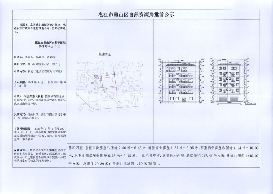 霞山区南柳中村西一路8号(李锦茹、吴盛飞、肖彩娇)新建房屋核发《建设工程规划许可证》批前公示