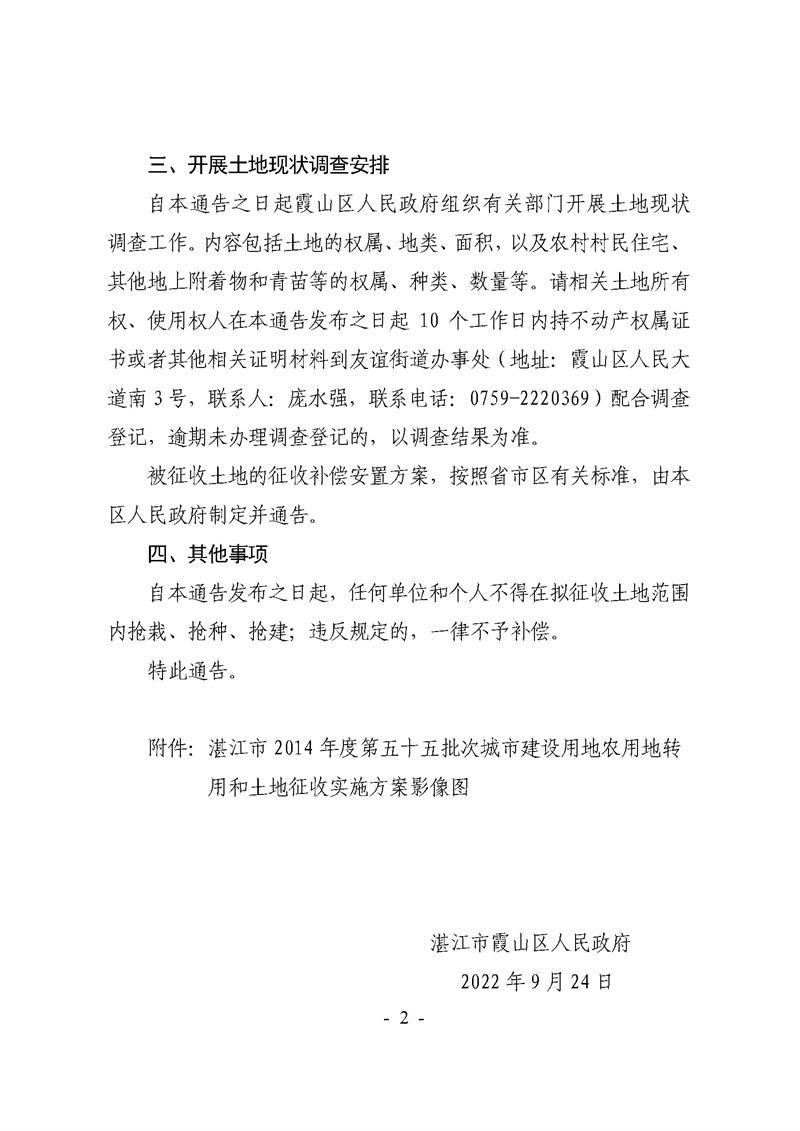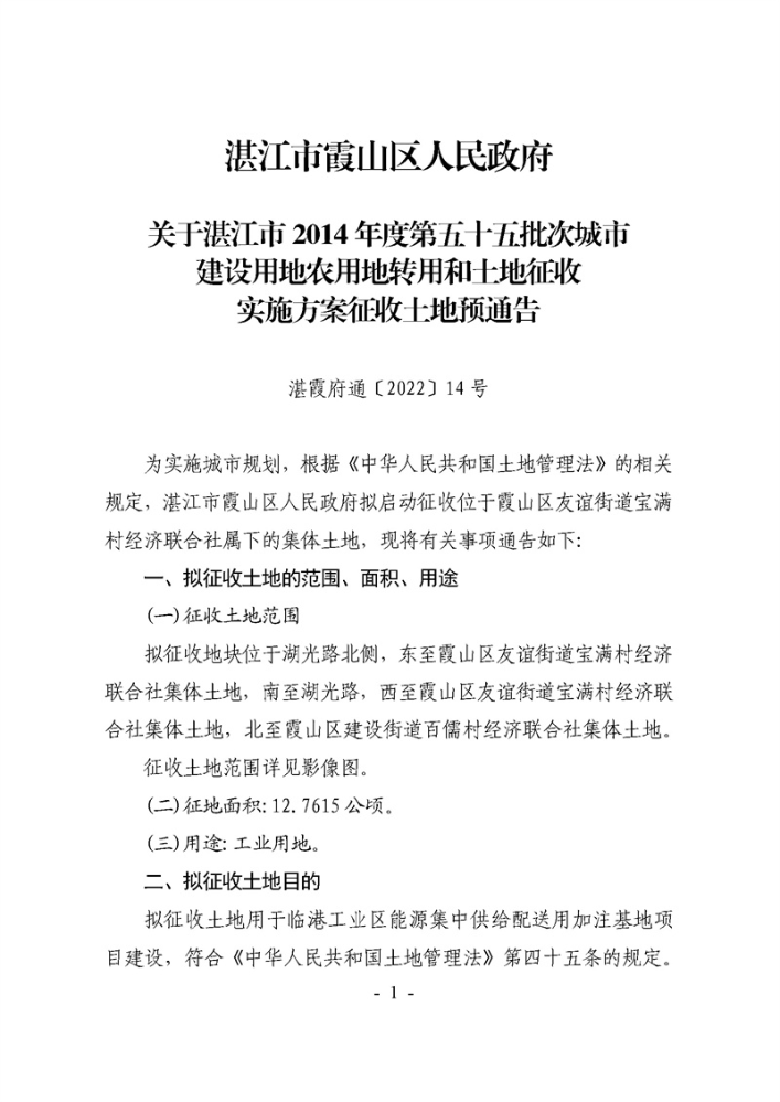 湛江市霞山区人民政府关于湛江市2014年度第五十五批次城市建设用地农用地转用和土地征收实施方案征收土地预通告