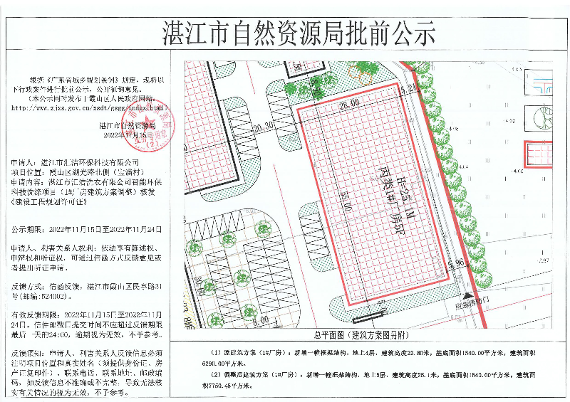 湛江市汇洁洗衣有限公司智能环保科技洗涤项目(1#厂房调整)核发《建设工程规划许可证》批前公示