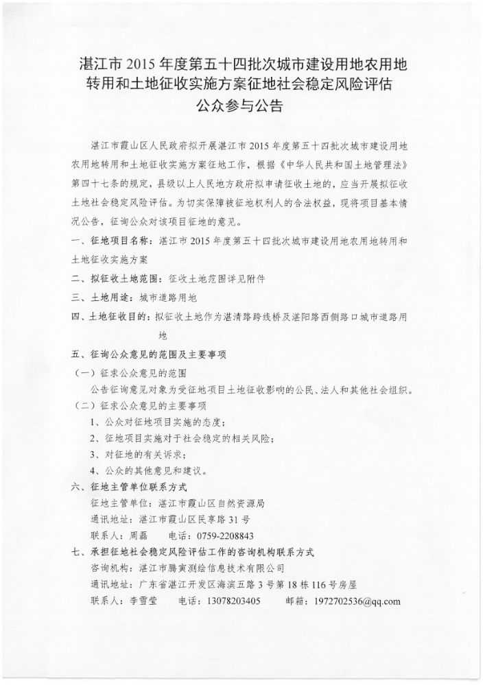 附件1:湛江市霞山区人民政府关于湛江市2015年度第五十四批次城市建设用地农用地转用和土地征收实施方案征收土地预通告.pdf