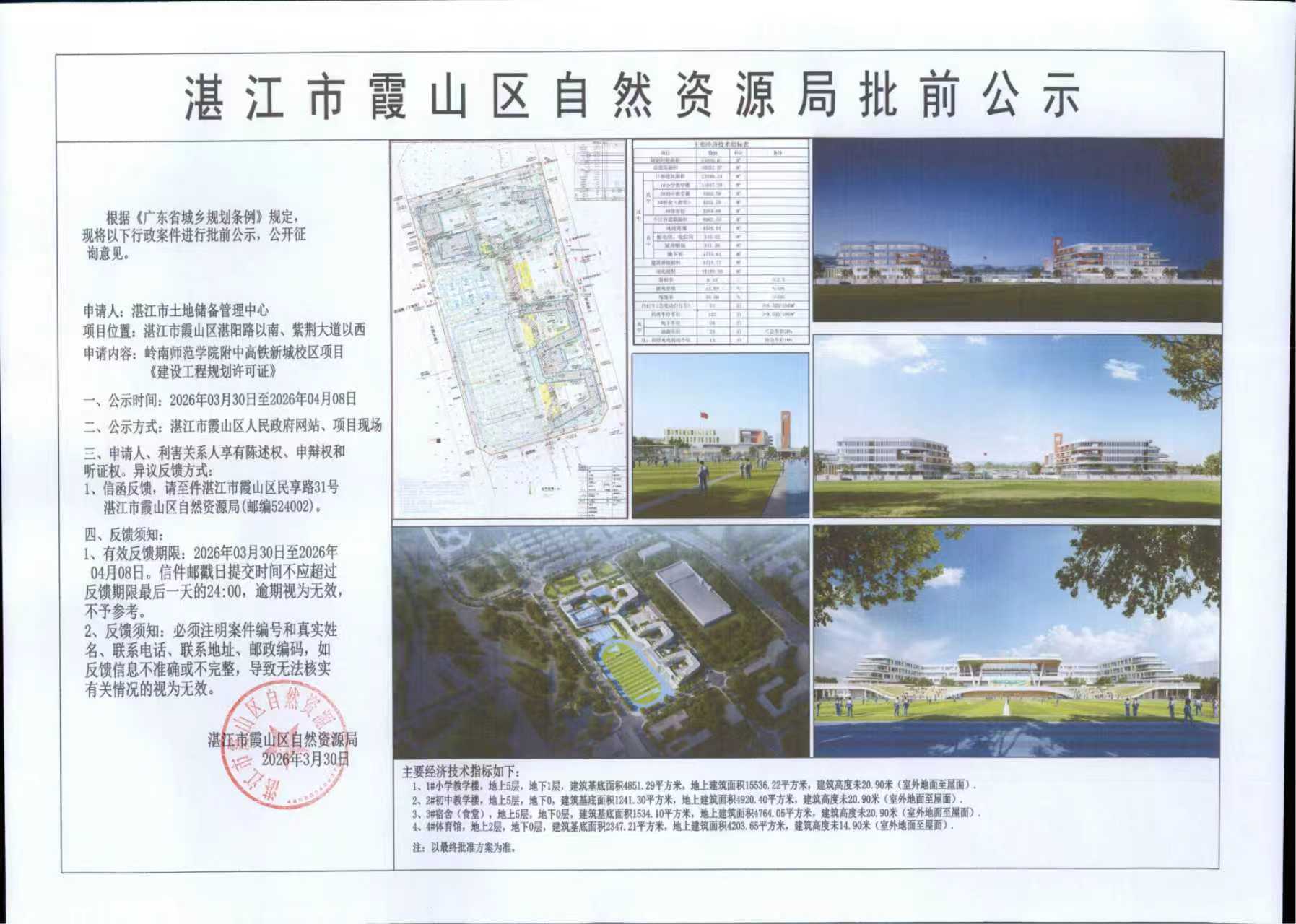 岭南师范学院附中高铁新城校区项目《建设工程规划许可证》批前公示