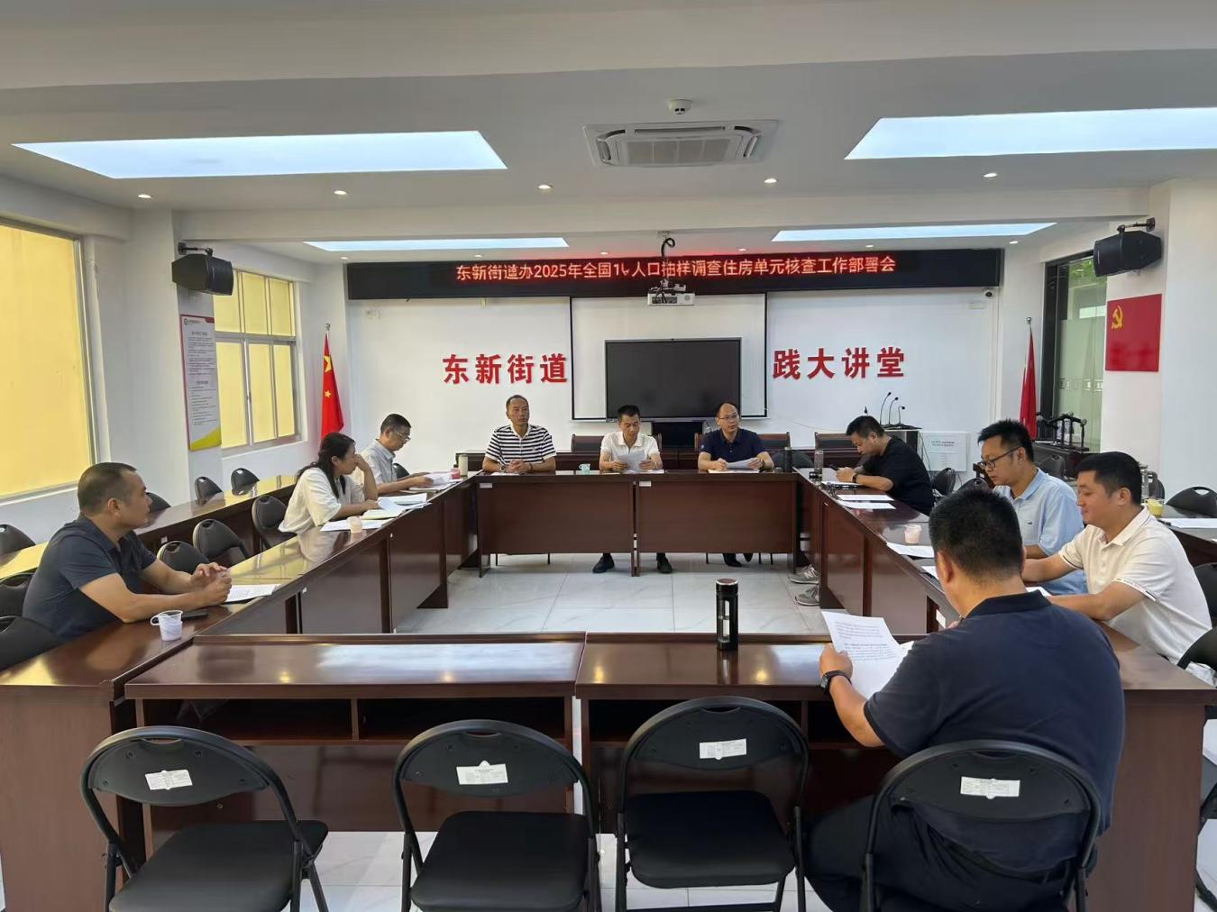 2025年5月9日,东新街道办事处召开党工委会议,决定成立东新街道2025年全国1%人口抽样调查工作协调小组。2025年9月15日上午,东新街道办事处召开2025年全国1%人口抽样调查住房单元核查工作部署会。2025年8月6日-31日,东新街道开展全国1%人口抽样调查建筑物标绘和调查小区划分工作,共完成上报6个抽样村居社区、建筑物2201个。2025年9月15日-10月20日,我街道将对抽中的调查小区进行全覆盖住房单元核查,为2025年全国1%人口抽样正式调查的高效开展奠定坚实工作基础。