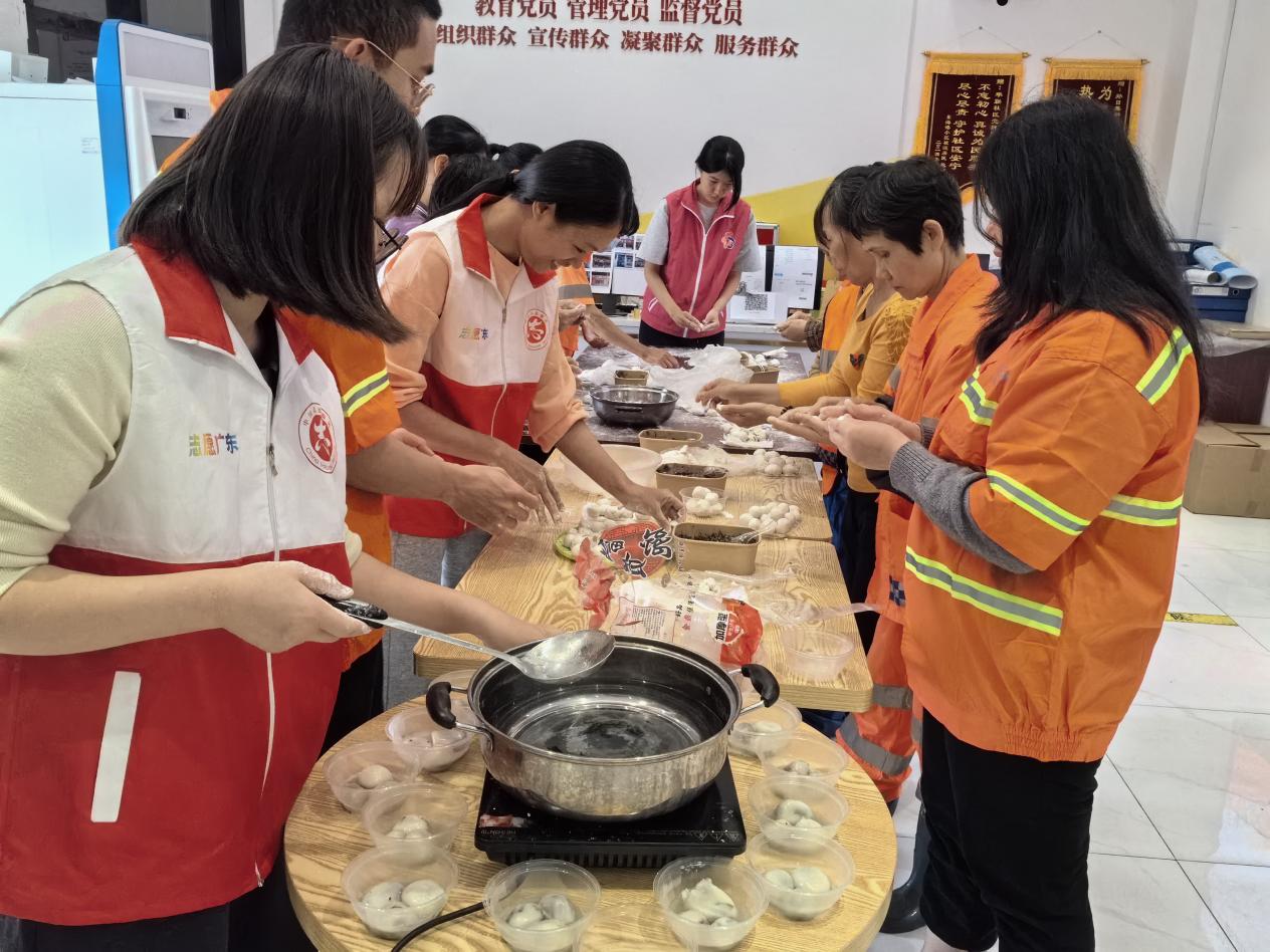 煮好的汤圆热气腾腾,志愿者们将一碗碗象征团圆与祝福的汤圆送到户外劳动者手中,并将包好的汤圆打包送上带回家。社区负责人表示:“户外劳动者是城市的‘美容师’,他们用辛勤汗水守护着市容整洁,希望这碗汤圆能让他们感受到‘家’的温暖。”