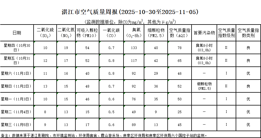 湛江市空气质量周报(2025-10-30至2025-11-05)