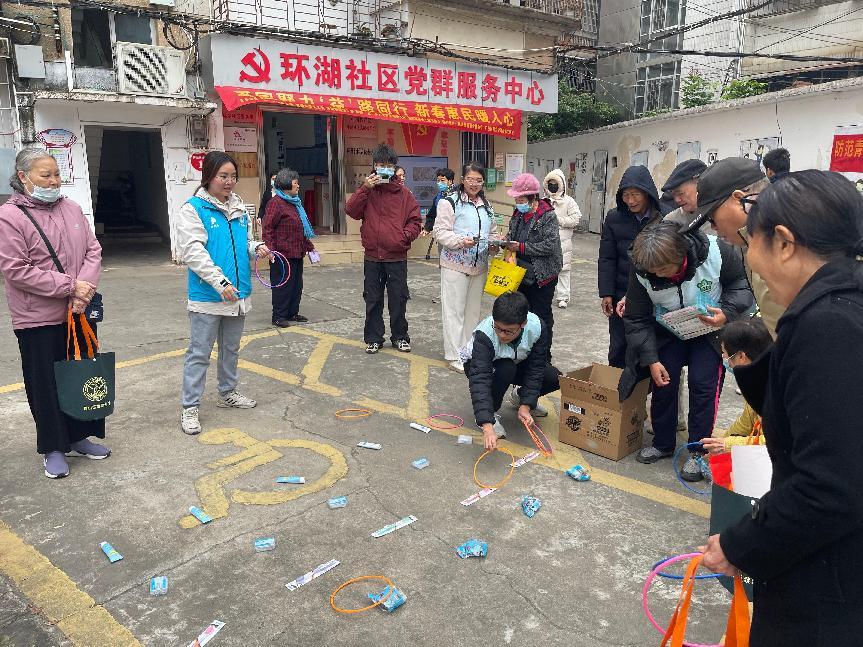 趣味互动区:“套圈圈”游戏人气高涨,居民手持彩圈,瞄准心仪礼品,欢声笑语不断,满载而归。