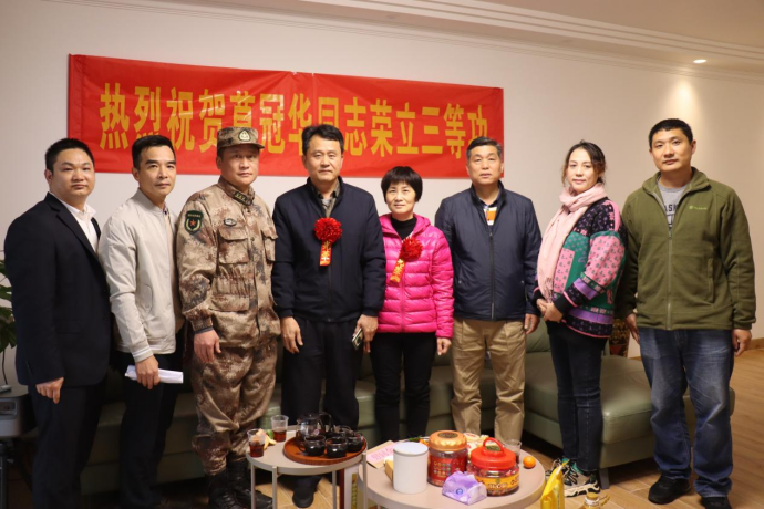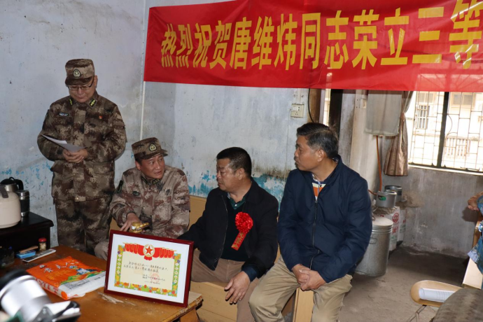 在醒目的“热烈祝贺唐维炜同志荣立三等功”的横幅下,陈宇全政委一行将喜报送到现役军人唐维炜父亲手里,祝贺唐维炜取得优异的成绩,并与家属进行亲切交谈,详细询问他的工作、生活情况,对他们为军队培养了优秀人才表示衷心的感谢。唐父表示,感谢党和政府的关怀,一定做好孩子的坚强后盾,鼓励孩子继续努力,再创佳绩。