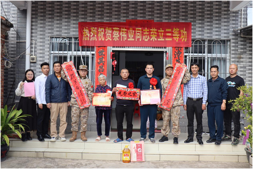 为荣立三等功的现役军人蔡伟业的家庭送上喜报
