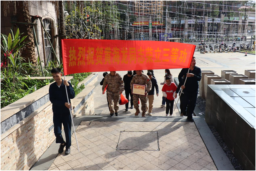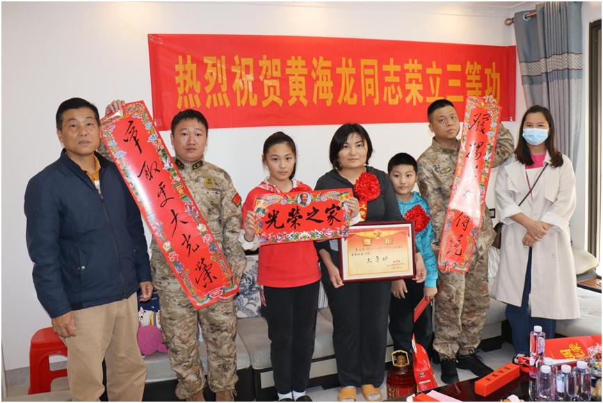 为荣立三等功的现役军人黄海龙的家庭送上喜报