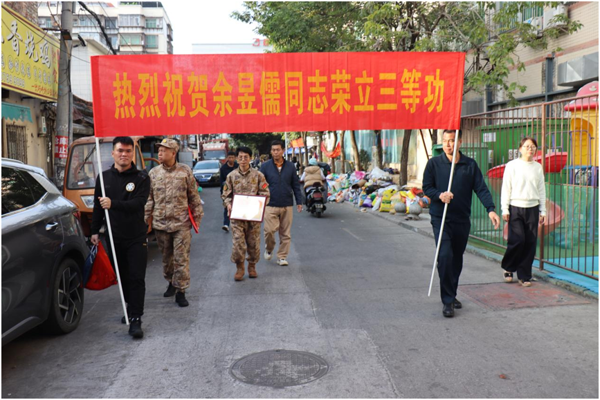 骏马奔腾迎新春,荣光熠熠映军魂。2026年春节即将来临之际,为深入贯彻落实拥军优属光荣传统,推动军人荣誉体系建设走深走实,让立功军人及家属度过一个温馨、光荣、祥和的春节,霞山区退役军人事务局联合区人武部和街道退役军人服务站组成专项慰问组,先后到荣立三等功的现役军人蔡伟业、黄海龙、余昱儒和唐维炜的家中开展送三等功喜报活动,把党和政府的关怀温暖传递到每一户功臣家庭,让“一人立功、全家光荣”的社会风尚在新春佳节里愈发浓厚。