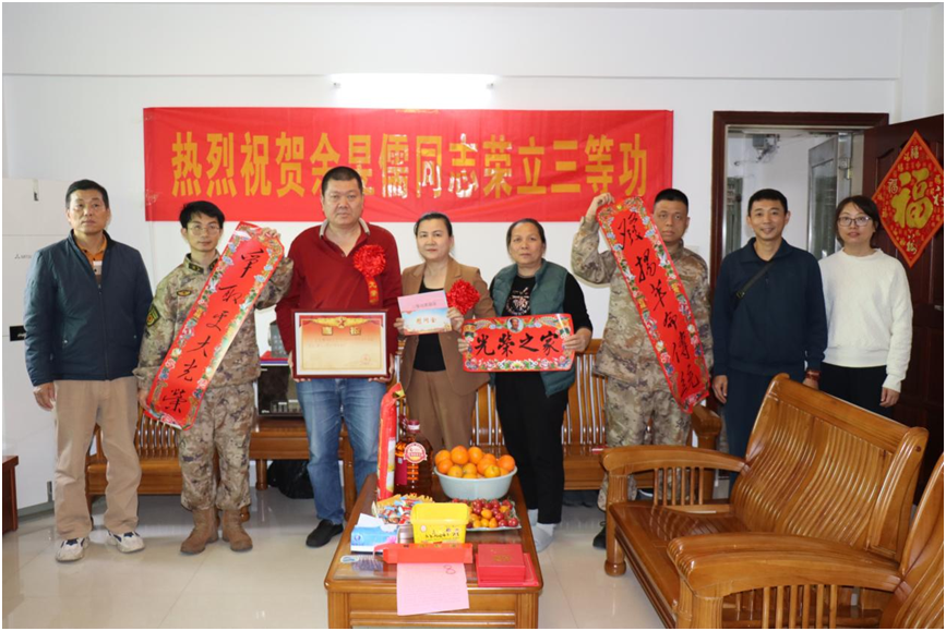 为荣立三等功的现役军人余昱儒的家庭送上喜报