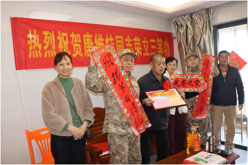为荣立三等功的现役军人唐维炜的家庭送上喜报