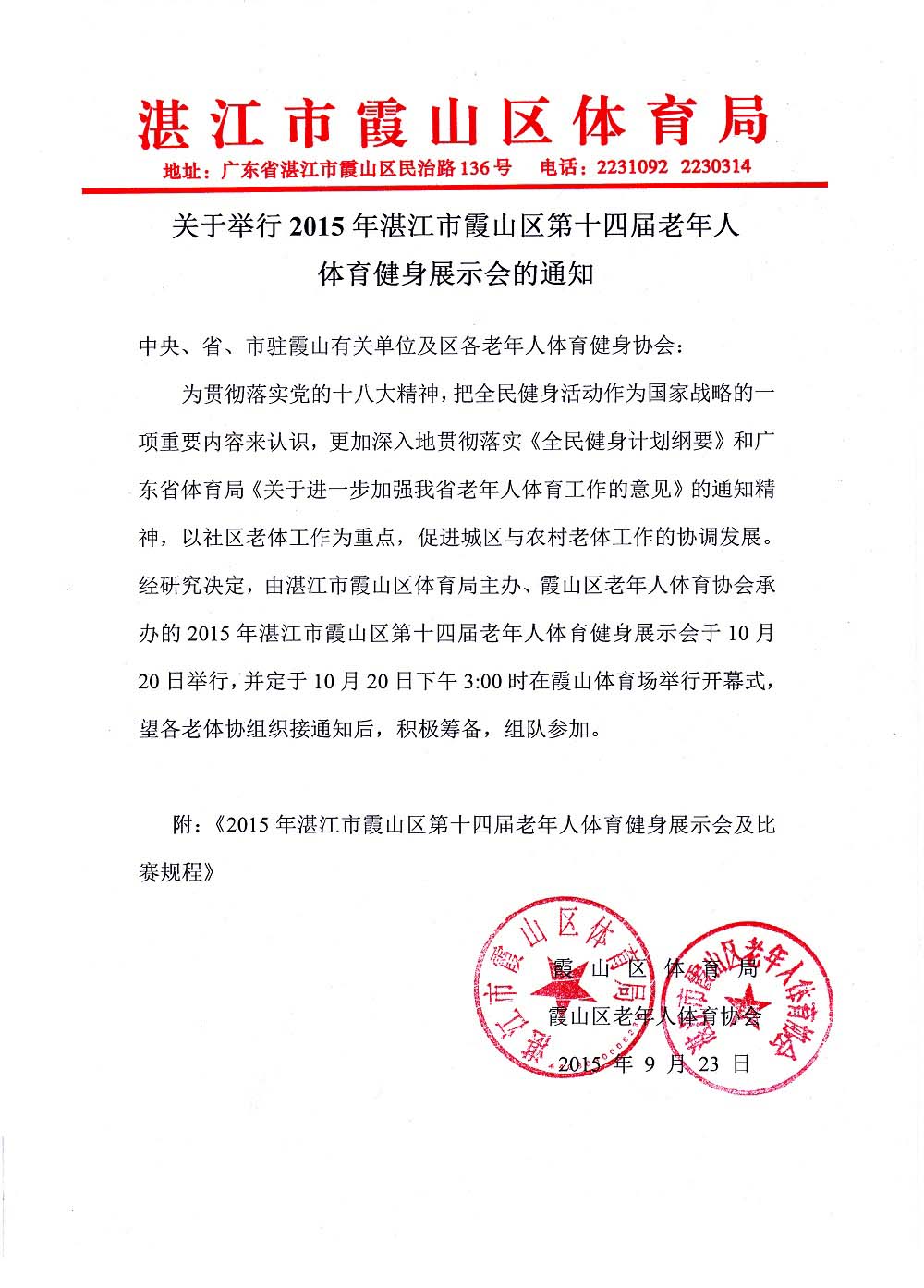 关于举行2015年湛江市霞山区第十四届老年人体育健身展示会的通知