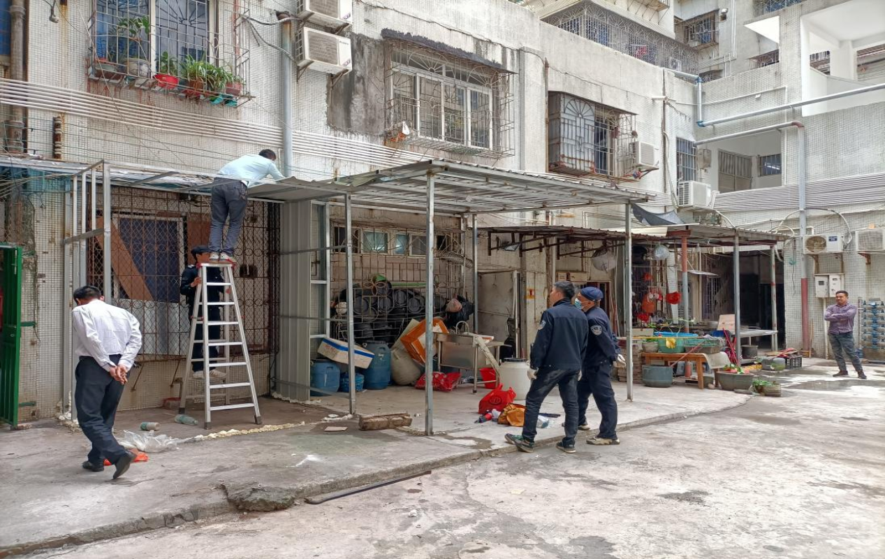 3月16日,执法办工作人员对辖区另一处占道搭建的违建物进行拆除清理整治,消除消防安全隐患。据执法人员现场勘查及询问,该违建铁皮屋搭建在两栋楼房间的人行过道上,背面紧靠教育局宿舍的上下楼梯,由铁皮、卷闸门及易燃的木板搭建而成,占地面积约50平方米,为私人搭建出租用于中医药店,堵塞原本的消防逃生通道,一旦发生火灾,人民群众的生命财产安全将岌岌可危。针对此情况,街道人大工委主任钟正才、执法办主任何世政,以及东堤社区等工作人员多次上门与业主沟通,告知其违规搭建的铁屋存在消防的安全隐患。经劝导,该业主同意拆除违建铁皮屋,工作人员于3月16日对该处违建物进行依法拆除。