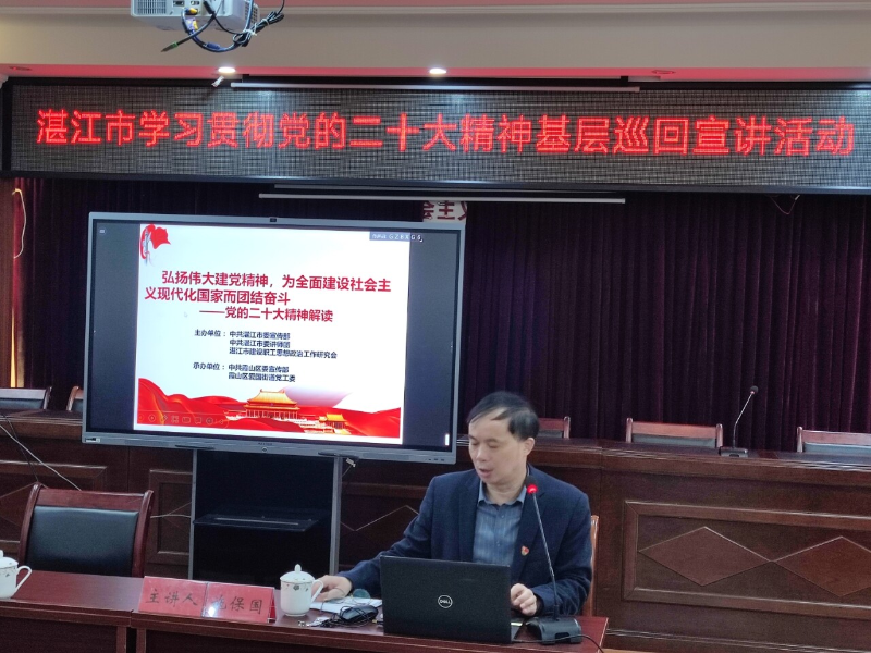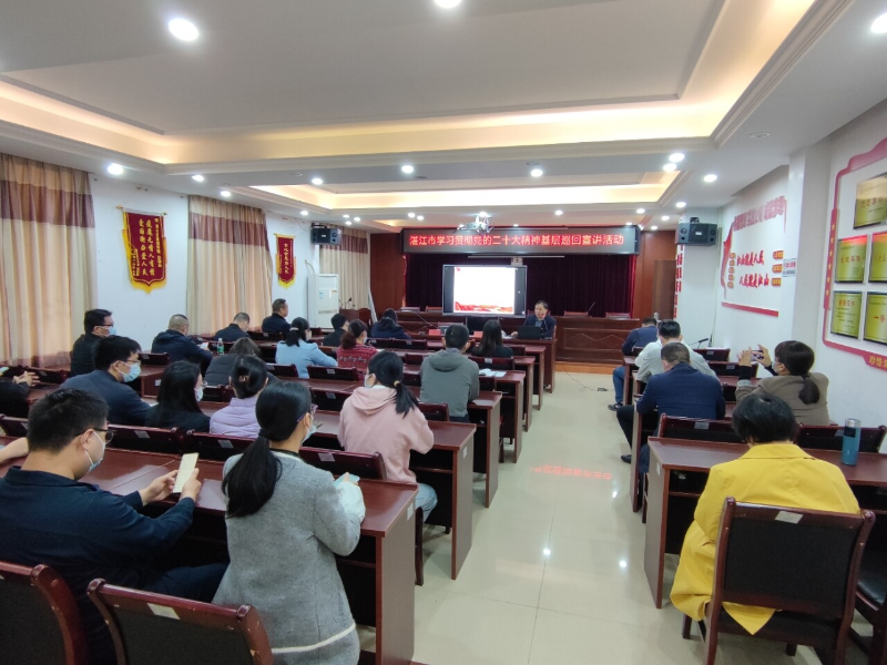 为推动习近平新时代中国特色社会主义思想深入人心,推动党的二十大精神融会贯通到街道各项工作的全过程,推动党的二十大精神在基层落地生根,2月22日,由市委宣传部、市委讲师团、市建设职工思想政治工作研究会主办,区委宣传部、爱国街道党工委承办的湛江学习贯彻党的二十大精神基层巡回宣讲活动在爱国街道会议室举行。