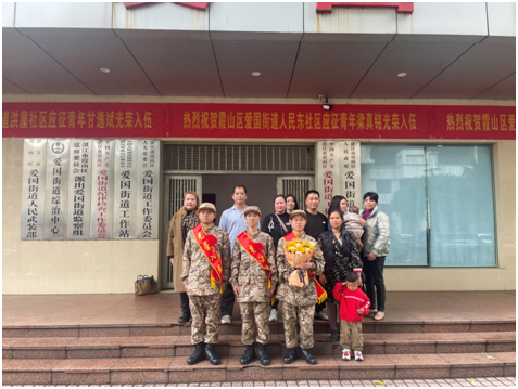 着军装、肩挂绶带、胸戴红花,在家人和街道干部的陪同下,即将奔赴军营,开始人生新征程。