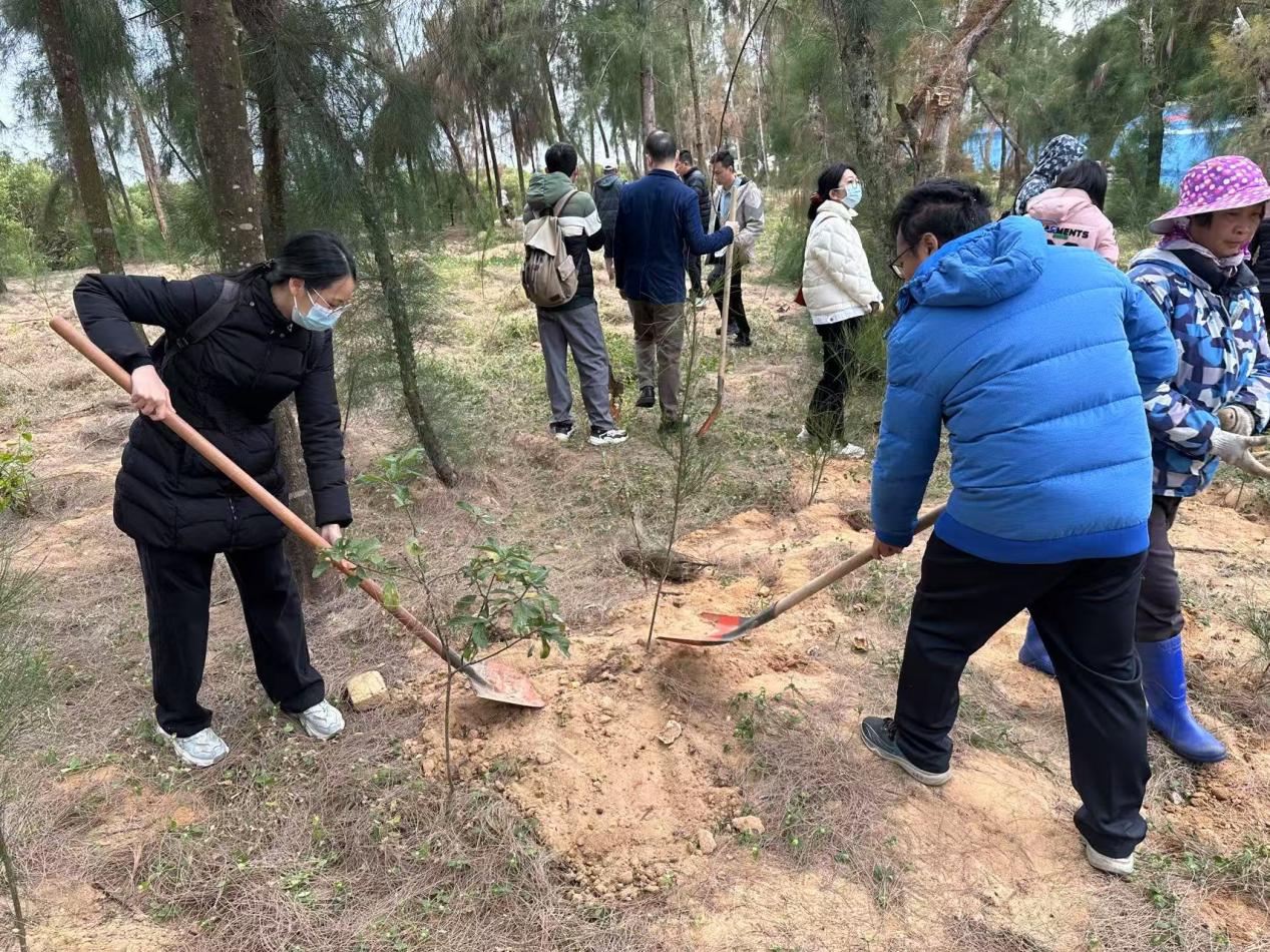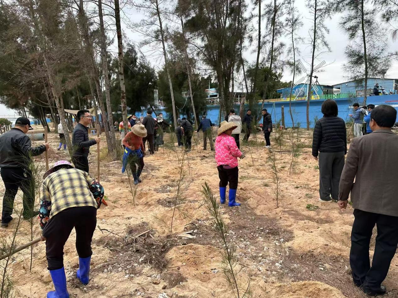 活动当天,现场热闹非凡。在沿海滩涂区域,党员干部与志愿者们热情高涨,大家分工明确,干劲十足。党员们冲锋在前,带领乡贤、群众和志愿者们迅速投入植树工作。有的挥锹铲土,有的扶苗填坑,有的提水浇灌,每一道工序都认真细致。在大家齐心协力之下,250棵木麻黄树苗被稳稳地栽种在沿海滩涂。据了解,这些木麻黄不仅能防风固沙,保护海岸线生态,还能改善沿海地区的空气质量,为海洋生物提供栖息地,对维护当地生态平衡具有重要作用。
