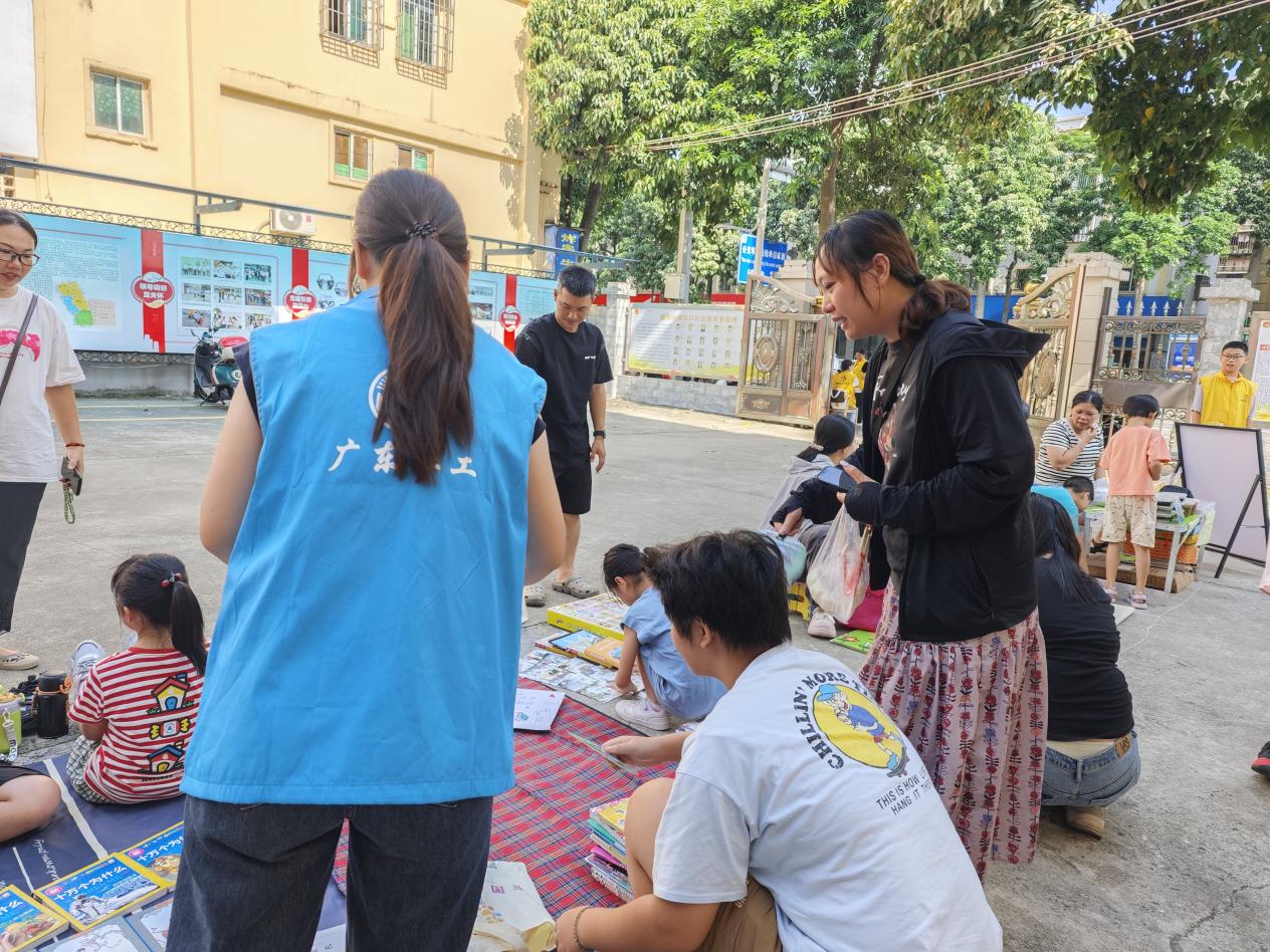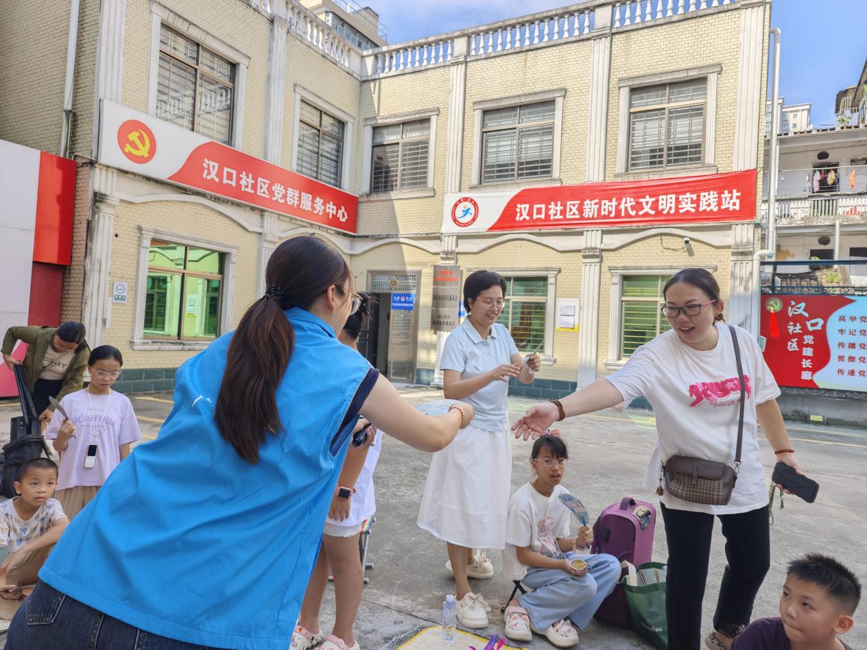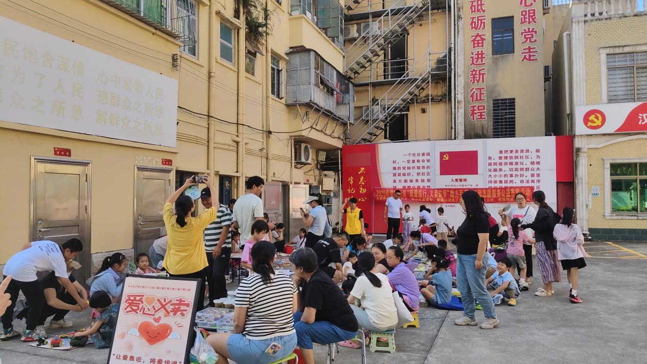 当天天气炎热,但现场依旧人头攒动,社工及时为家长孩子们送上清凉物资——扇子。摊位上的商品琳琅满目,既有居民自制的手工小吃,又有闲置书籍、儿童玩具等,每一件物品都承载着爱心与善意。