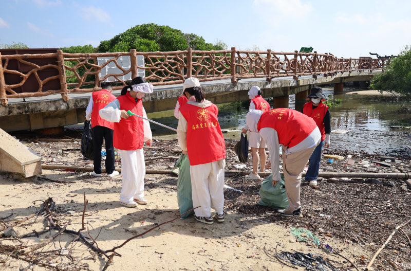 上午活动伊始,尽管阳光炽烈,气温较高,但参与活动的全体人员热情不减,干劲十足。他们身着志愿者标识的服装,手持垃圾袋、铁夹等工具,沿着红树林栈道及周边滩涂,仔细清理被潮水推上岸或游客遗弃的各类生活垃圾。志愿者们充分发扬不怕脏、不怕累的奉献精神,顶着炎炎烈日,弯腰俯身,认真捡拾散落在步道缝隙、石缝间及红树林根部的塑料瓶、包装袋、泡沫碎片、废弃渔网等海漂垃圾和陆地垃圾。经过近两小时紧张而有序的辛勤劳作,原本散落垃圾的区域变得整洁一新。据统计,此次活动共计清理收集各类垃圾十三袋,有效净化了观海长廊及红树林区域的生态环境。
