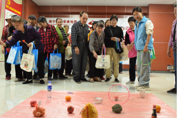 讲座结束,开启了一场沉浸式重阳节主题式体验:福气套圈圈!每人三个幸运圈,机会就在双手间,巧手投壶,三箭送福。瞄准心仪的奖品,稳稳抛出去,投中即得奖,各位长者身手不凡,其乐无穷!