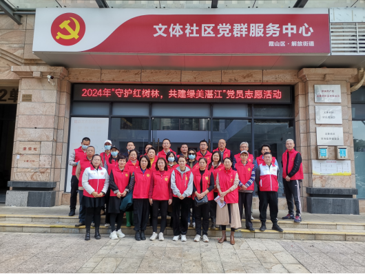 2024年1月5日,解放街道文体社区党支部联合“双报到”党组织湛江市霞山住房保障中心、湛江市房地产档案馆、湛江市房屋租赁事务中心、湛江市房地产交易所、湛江市建筑节能综合事务中心共35名党员干部到观海长廊红树林片区开展“守护红树林,共建绿美湛江”党员志愿活动。