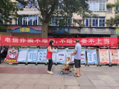 街道干部向来往群众派发反电诈宣传单,派出所民警给群众讲解《中华人民共和国反电信网络诈骗法》。