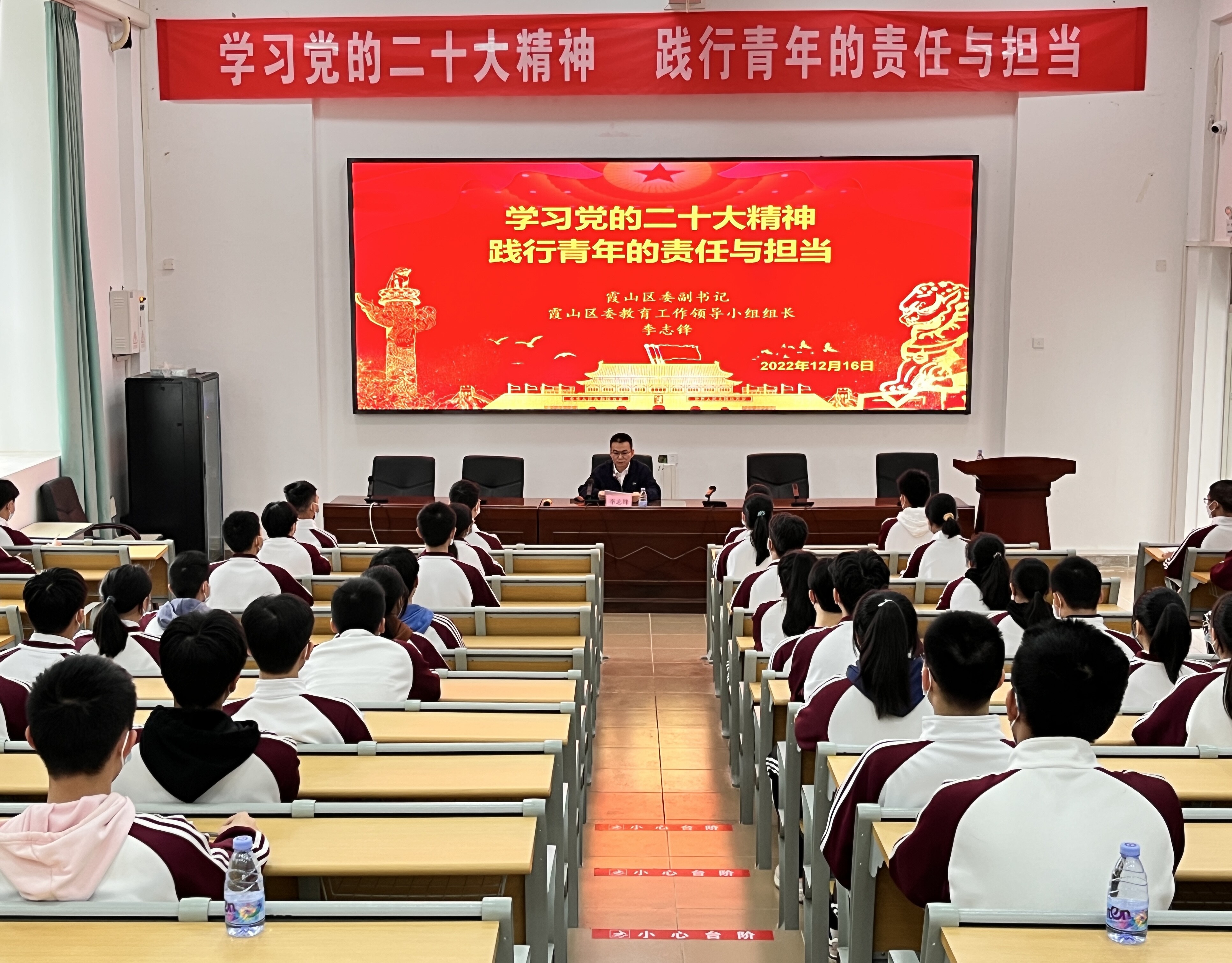 12月16日下午,区委副书记李志锋走进湛江市第二十一中学,以《学习党的二十大精神,践行青年的责任与担当》为题,为学生讲授思政课。