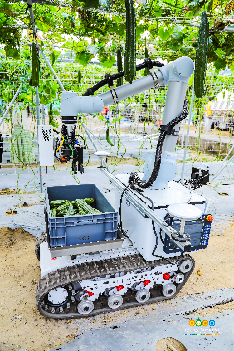 现代农业装备展上,全自动果蔬采收机器人正在演示采收丝瓜