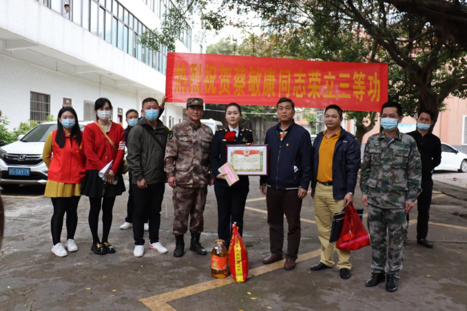 接着,慰问组一行来到现役军人蔡敏康妻子的单位。现场,慰问组与其妻子进行亲切的交谈,了解他们的近期生活,并为蔡敏康妻子戴上大红花,送上奖状和慰问金等。慰问组表示,希望蔡敏康同志继续发扬部队的优良传统和作风,也希望其家属继续做蔡敏康同志的坚强后盾,全力支持其报效国家、建功立业,并向他们送上新春节日的祝福。