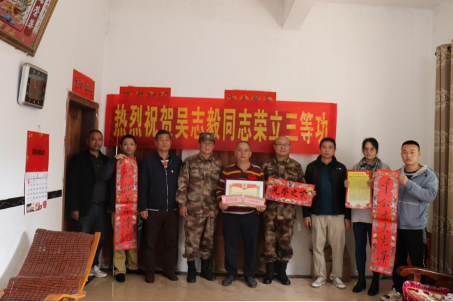 为立功受奖军人吴志毅同志的家属送上立功喜报、节日慰问金、慰问信、春联及慰问品