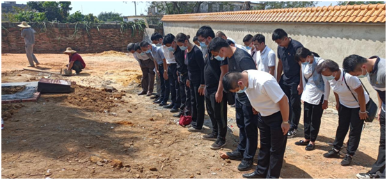 霞山区退役军人事务局副局长钟敏主持仪式。全体人员肃立,向烈士默哀、行鞠躬礼。新兴街道党工委书记黄鹏宇宣读了烈士证明书和烈士简历。烈士遗骸下葬,家属为烈士灵龛盖上鲜艳的五星红旗。随后,工作人员向烈士敬献花圈,霞山区退役军人事务局黄峰局长上前整理缎带,告慰先烈,寄托哀思。