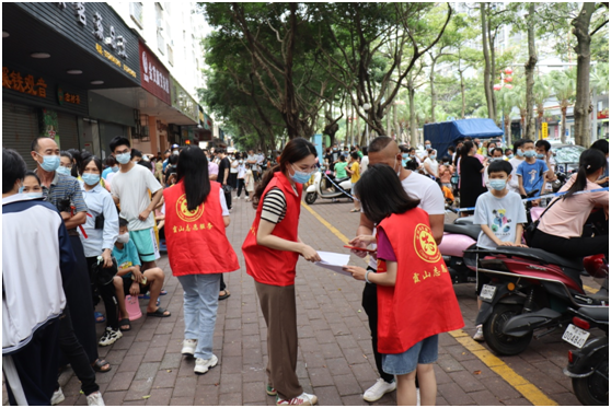 冲锋在前,奔走一线。“大家别着急,打开粤核酸码,间隔一米,不要靠太近……”霞山区退役军人事务局工作人员身穿迷彩或红色志愿者服装,穿插在排队做核酸的群众队伍之间,或维持秩序,或指引群众出示粤康码,或为群众发放咽拭子,各司其职,驻守在自己的岗位上,迅速上手自己的工作,为前来做核酸检测的群众提供入口引导、健康码识别、信息登记、检测引导等服务,确保核酸检测工作高速有序进行。
