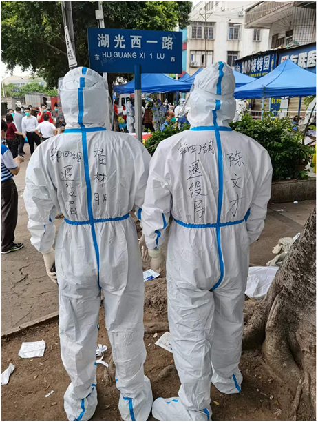 陈文才、桂林朋两位同志在封控区外着装完毕准备进场