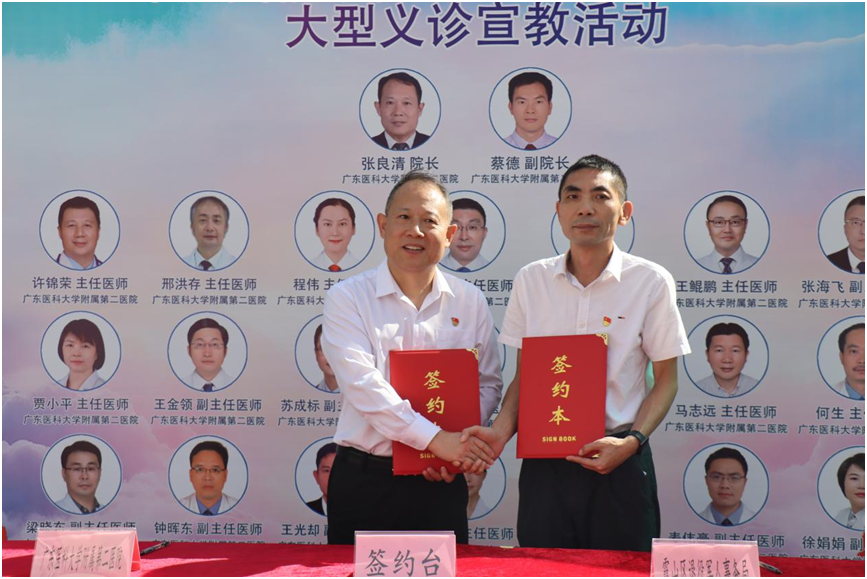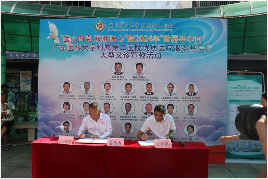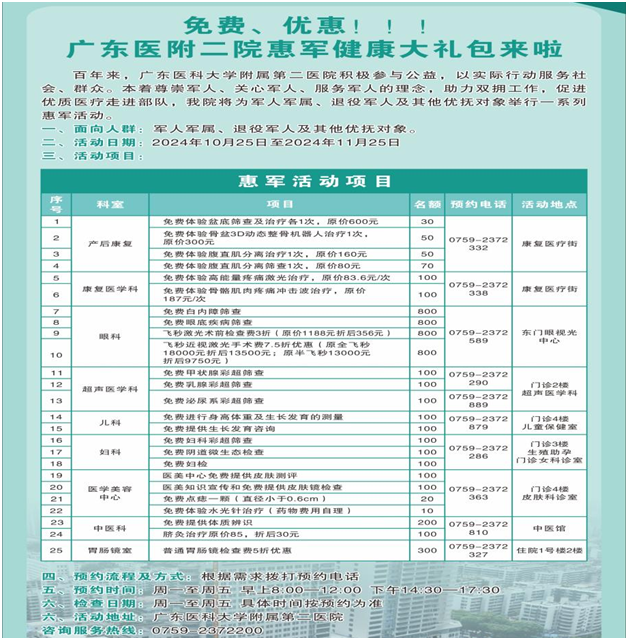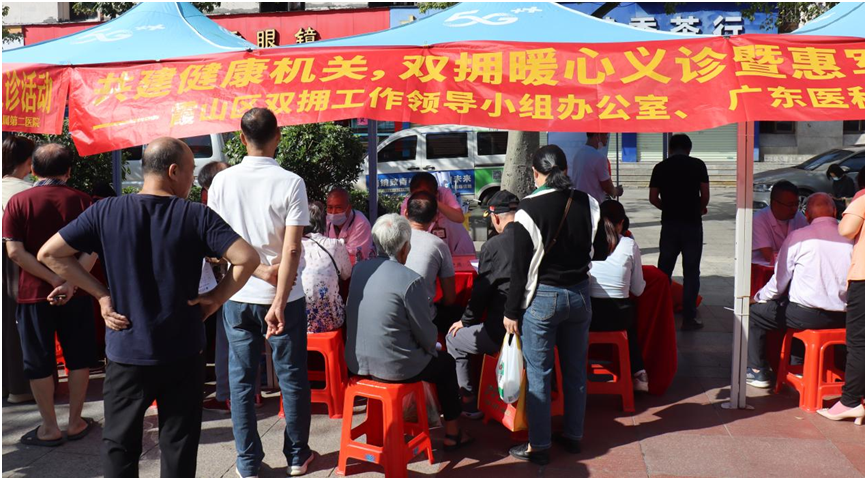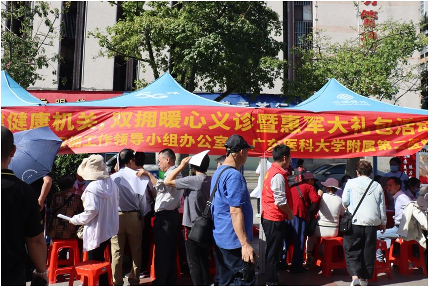 为进一步给霞山区现役军人和退役军人等其他优抚对象及无军籍职工打造一个更加完善的健康服务平台,提高服务对象的健康意识和自我保健能力,霞山区退役军人事务局积极发挥桥梁纽带作用,加强与医院的沟通合作,10月25日上午,与广东医科大学附属第二医院在霞山区步行街(第13场双拥志愿服务活动现场)举办“共建健康机关”签约仪式,搭建健康桥梁,为服务军人和退役军人等其他优抚对象及无军籍职工打通就医“最后一公里”。湛江市退役军人事务局双拥工作科于岩岩科长、霞山区退役军人事务局黄峰局长、广东医科大学附属第二医院张良清院长参加签约仪式,蔡德副院长主持仪式并公布惠军健康大礼包实施方案。当天,广东医附属二院派出23名专家(其中18名博士)团队参加霞山区双拥志愿服务活动,为军人、军属、退役军人和三属等优抚对象及广大市民举行义诊、免费体检、赠送药品、医学急救知识宣教等志愿服务活动。