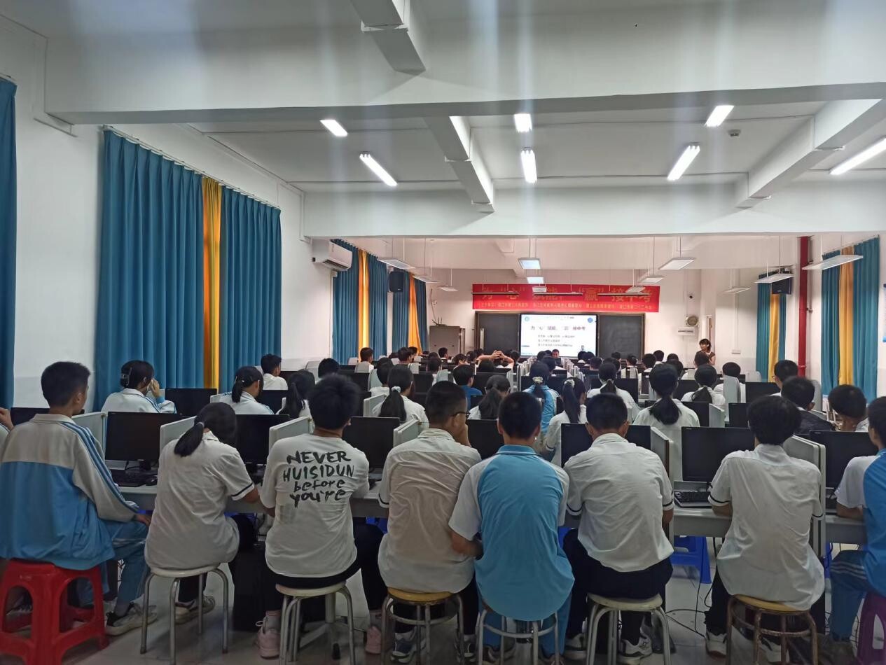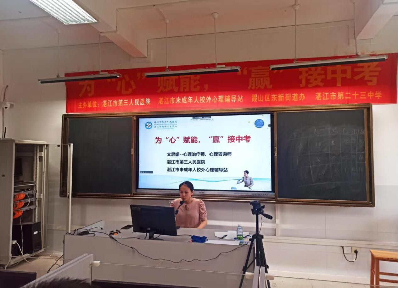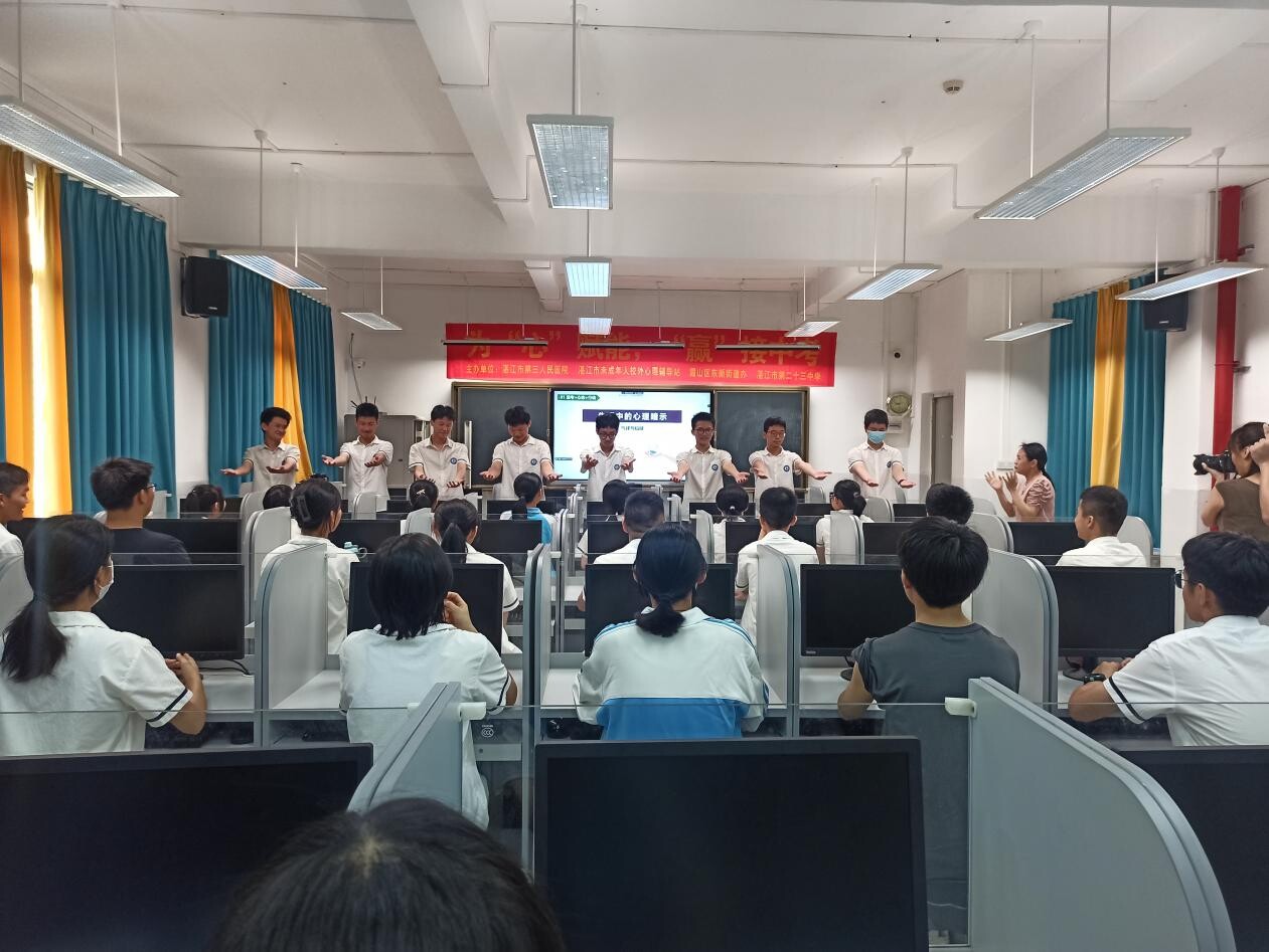 三载奋战,一朝试锋。中考开启了倒计时,学生也进入了“心理高原”期,急躁、焦虑、情绪不稳等问题接踵而来。为帮助初三考生更好地进行考前心理调适,缓解考前焦虑,以乐观的态度、昂扬的斗志备战中考。4月29日上午,霞山区东新街道联合文明单位湛江市第三人民医院、湛江市未成年人校外心理辅导站在湛江市第二十三中学开展新时代文明实践所结对共建活动--为“心”赋能 “赢”接中考。活动利用腾讯会议形式在学校电脑室设主会场,各班级教室设分会场同步举行,覆盖学生约400多名。
