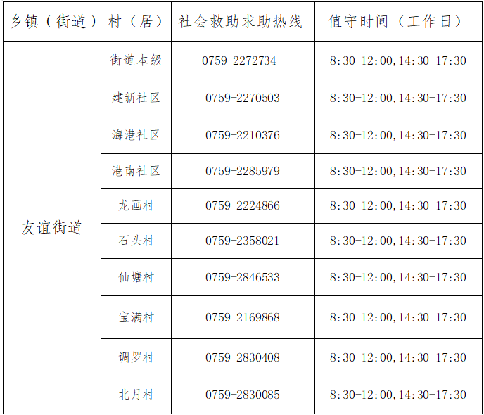 为进一步做好困难群众求助工作,根据《广东省民政厅办公室关于印发广东省社会救助领域基层政务公开标准指引的通知(粤民办函〔2019〕223号)》要求,湛江市霞山区友谊街道畅通社会救助投诉举报渠道,现在官方网站公布社会救助服务热线,欢迎有需要的困难群众拨打。