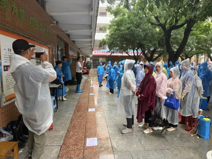 在统一引导下,消杀队员分为5个小组,有序领取消杀设备、防护装备及药剂,避免因混乱导致设备损坏或人员受伤。过程中,街道工作人员逐一检查队员的防护装备穿戴情况,叮嘱大家:“雨天地滑,消杀时步伐要稳,既要确保消杀无死角,也要保护好自己。”整齐的队伍、严谨的准备,成为雨中街道一道“硬核”风景线。