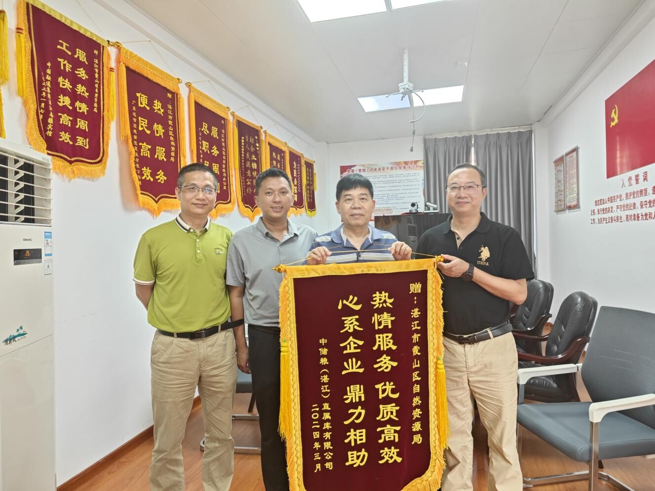 2024年4月2日,中储粮(湛江)直属库有限公司一行人向霞山区自然资源局赠送印有“热情服务 优质高效,心系企业 鼎力相助”的锦旗,对我局在中储粮项目用地规划调整过程中急企业所急、解企业所困的高效服务表示衷心感谢。